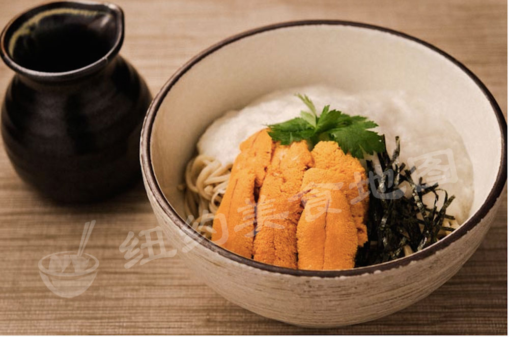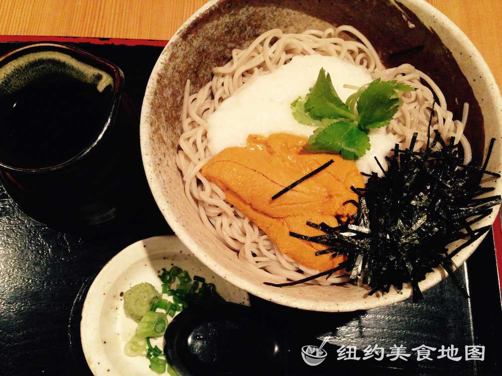 主打当然是荞麦面,菜单分为热荞麦面和冷荞麦面两种。冷荞麦就是传统的日式荞面, 摊在竹编的盛器上,蘸装在小杯的酱油吃。热荞麦面的汤底是烟熏过的鲣鱼汤,配上不同口味的配料。既然来了,当然冷荞麦和热荞麦都不能错过啦。先来个招牌海胆冷荞麦,