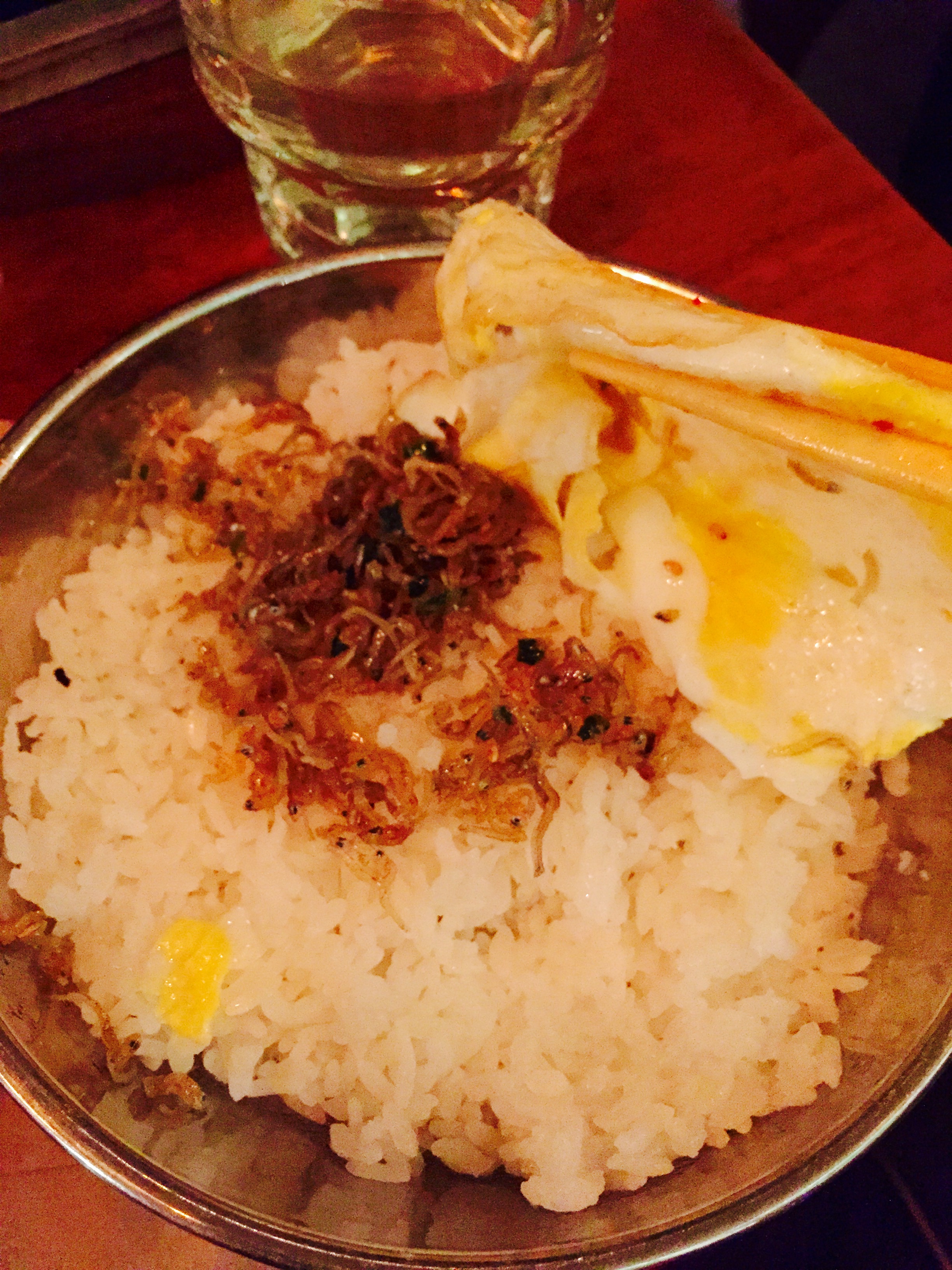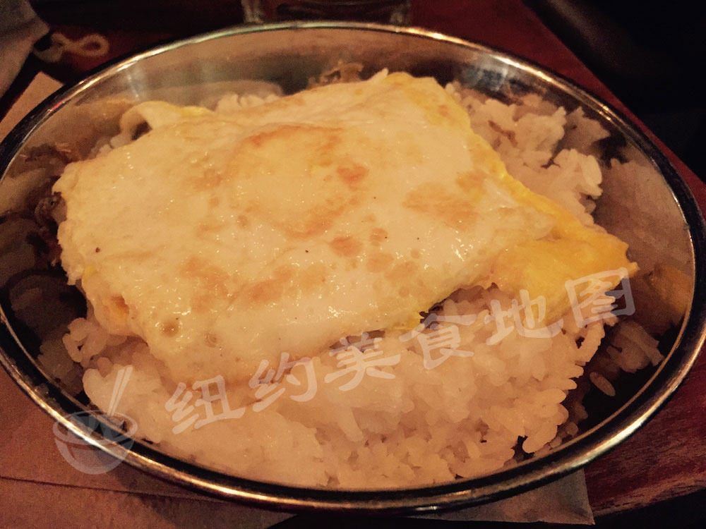 米饭倒是上的慢,吃了好一会儿帅锅欧巴端来了四碗米饭。众人大喜,如此豪华配置的白饭还是头一次见!(原谅众吃货一直走的草根平民路线),没一碗米饭上面盖了一个黄澄澄的荷包蛋!要不要这么豪气!掀开蛋来一看,还有惊喜?!平铺了一层油煎的香香的吻仔小鱼干!!!鲜甜可口,搭配软糯的米饭吃太合适不过了,还有开头赠送的韩式拌菜,OMG凑成一个套餐,下次能不能只吃这两样?(呵呵呵)