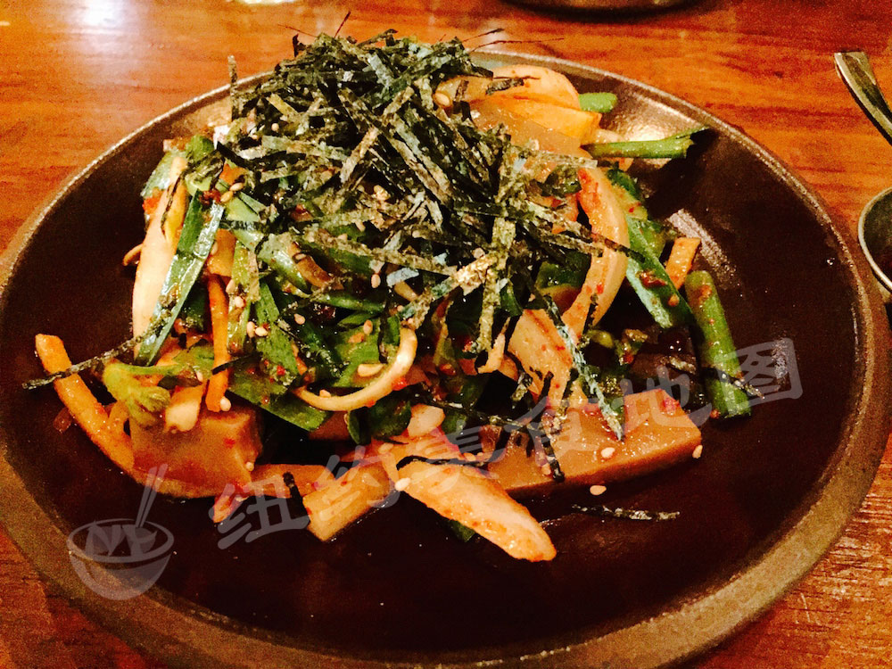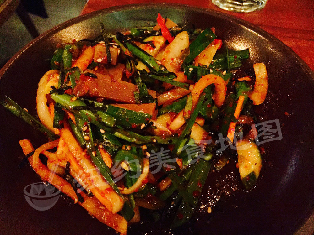 赠送的小菜,不同于传统韩餐的一摆一大桌之琳琅满目并一碟一口的噱头小菜,这里的小菜真的是很实惠,把各种小菜拌到了一起,called mook salad。有生韭菜,海苔,泡菜葱花和不知名的什么JELLY一样的东西凉拌的清爽开胃小菜,很赞!