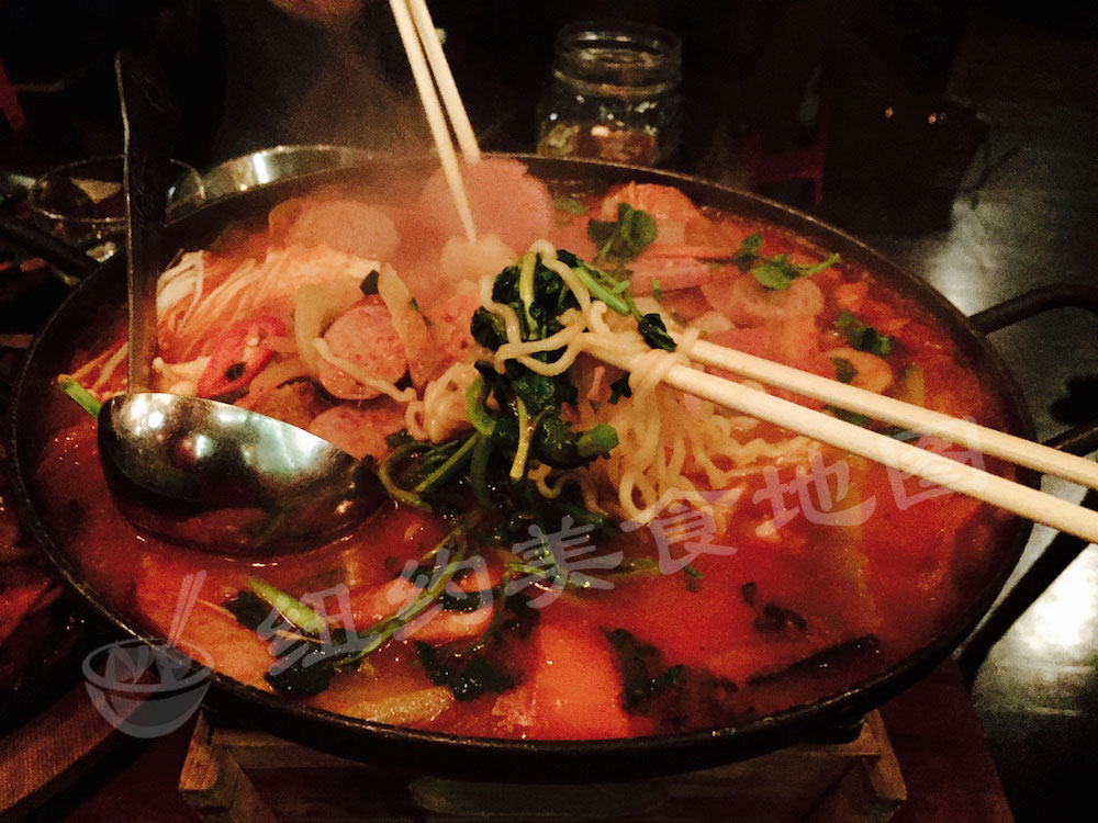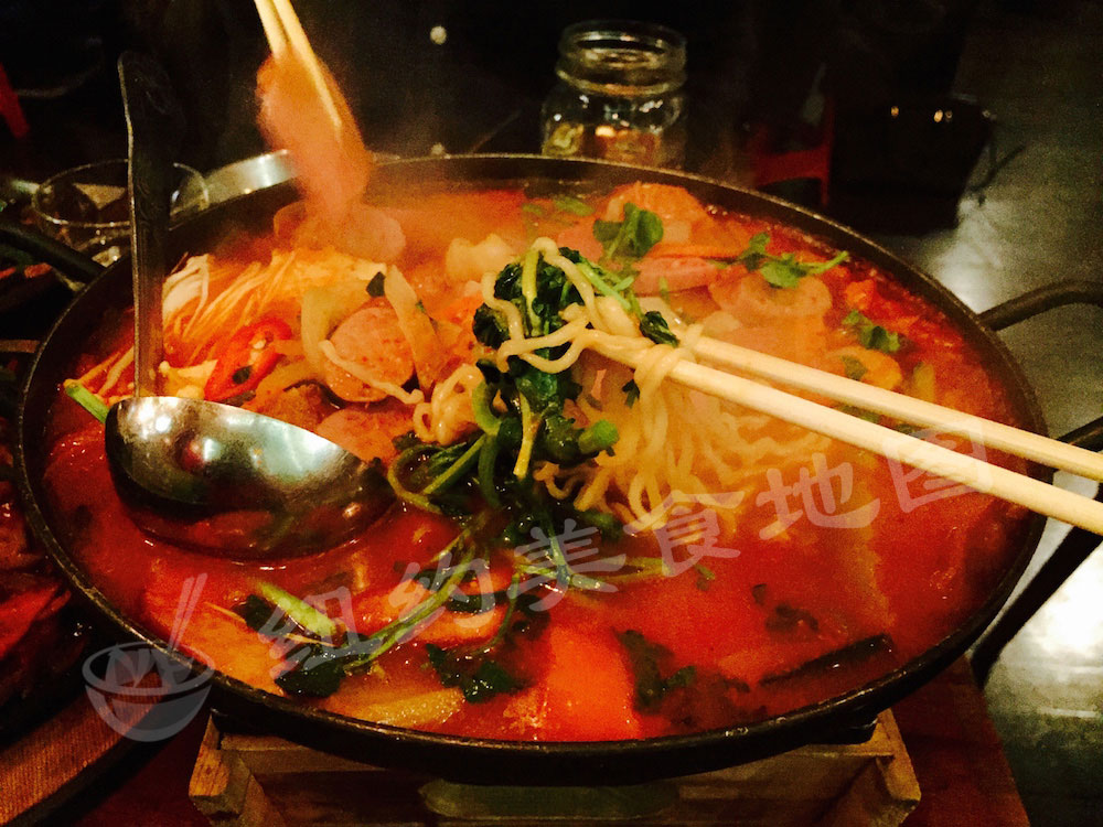 这道锅很不错! 各式的美式韩式香肠午餐肉,好像还有SALAMI,搭配泡菜金针和西洋菜等各式蔬菜煮成的著名韩式锅,没有很辣,但滋味儿浓郁,更重要的是里面有泡面!哈哈,不喜欢泡面你就老了!辛拉面煮的半熟放进汤里,配着各式蔬菜香肠泡菜一起吃,堪称最高逼格的土豪版辛拉面,可是获得了在场众吃货男女们的好评! 更赞的是他家的锅都有搭配一个小炉边少边吃,再冷的天也不用担心锅会变冷啦,take your time,慢慢吃,温暖全身的非滋补型韩式锅!