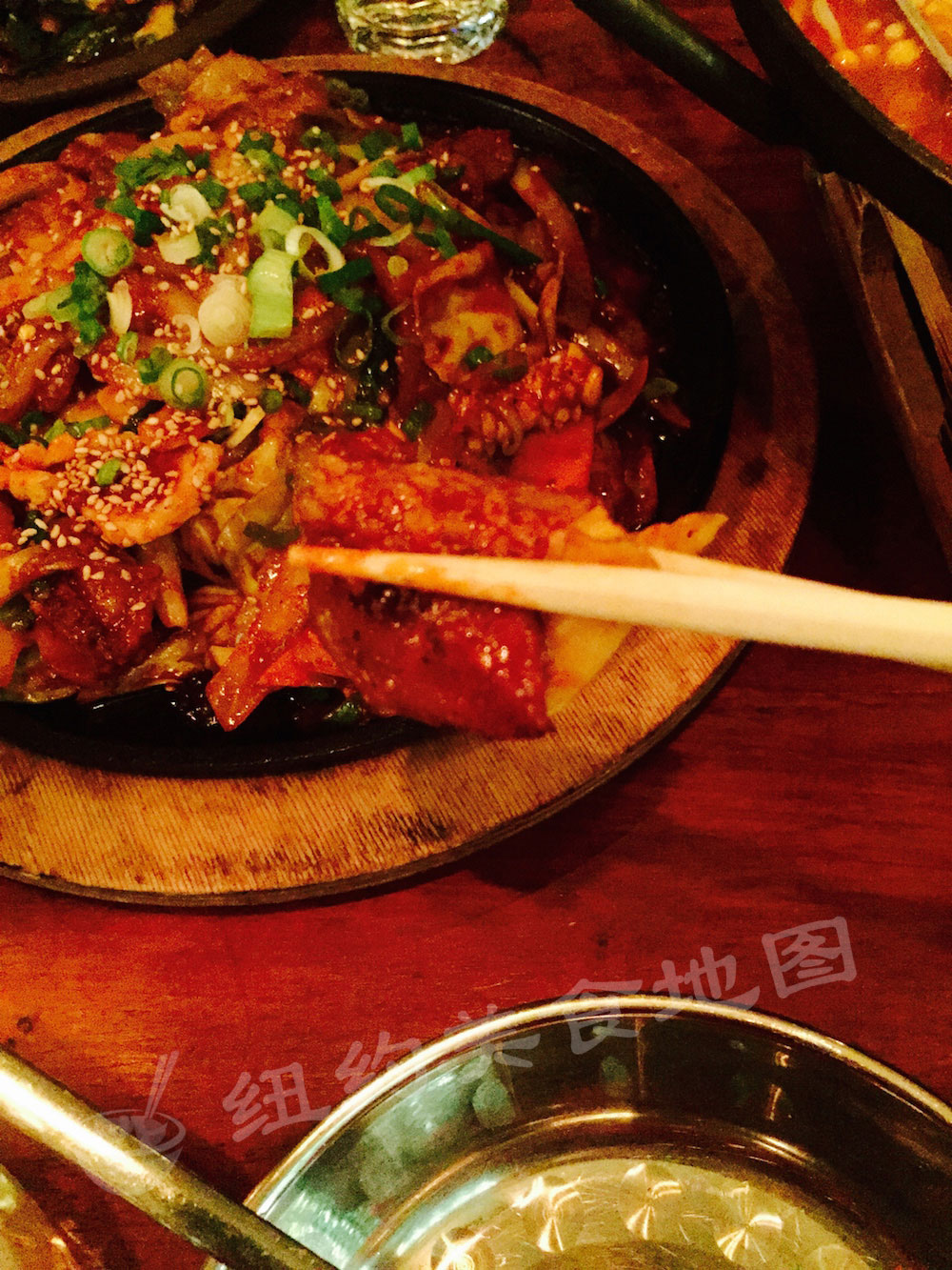 这道很下饭!虽说猪五花給去了皮,但是应该是先蒸熟再炒的做法,入口软烂却没有散,保持微微的嚼劲儿又入口即化,火候很赞!章鱼是花刀的切法,选材应该是大章鱼,所以肉质没有办法很鲜嫩,韧性足但是可接受,搭配韩式特有的甜辣酱汁,和刚刚炒到断生的蔬菜一起吃,浓郁香甜的滋味瞬间引爆了味蕾!五花肉配着泡菜和着浓郁的SAUCE和舌尖掠过若有若无的一丝烤芝麻的香气一起吃下,再来一口烧酒,那滋味,怎一个爽字了得!觉得腻了再来快章鱼须和着刚刚断生的洋葱一起吃,辛香爽辣,瞬间好想要碗白饭啊!