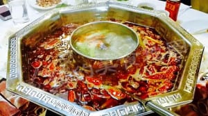 重庆人吃火锅第一步干什么? 烫毛肚和鸭肠!何为烫?在诸如其余主菜之前,在高汤咕嘟咕嘟烧开冒泡的时候,用筷子挑上一块薄片大块毛肚,放在红油冒泡烧开之处,等20秒,从汤中取出,毛肚就烫好了。鸭肠这种食材在纽约就不奢望了,而一般的火锅店的牛百叶,也根本不是传统意义上的毛肚,重庆烫毛肚是薄薄扁扁的一大片,之所以20秒能烫熟,也源于毛肚切片薄度与受热宽度,那种脆爽入位味道是一般牛百叶无法比拟的。